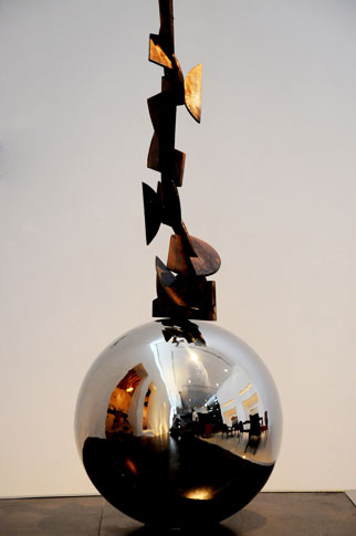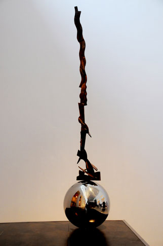 Khalid Farhan displays his new experience in this building with his sculpture and collage works using copper and chrome as raw materials. His sculptural works are characterized by the nation of the abstract using the brown color as reference to the coffee.
