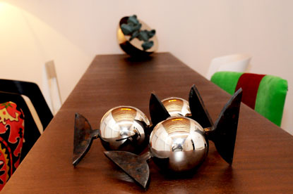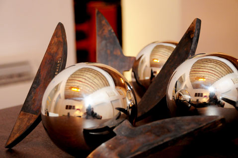Khalid Farhan displays his new experience in this building with his sculpture and collage works using copper and chrome as raw materials. His sculptural works are characterized by the nation of the abstract using the brown color as reference to the coffee.